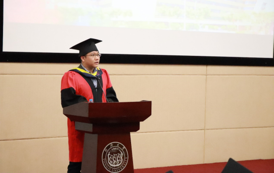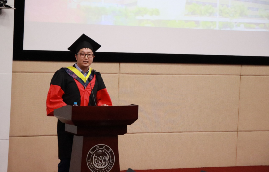 2018年上海市优秀毕业研究生、yl7703永利第十一届研究生“学术先锋”潘仲彬博士代表全体毕业生发言,他以人生选择和个人经历感慨学无止境,三载求学春秋,强大的信念支撑,一贯的坚持不懈,成就了自信满满、追求卓越的我们。他真挚感谢母校包容了我们的懵懂无知,孕育了我们的成熟睿智。大家相约,即便走得再远也要记得回来,特别为母校、材料学院的明天再留下一份情、一份心。无论何时何地,将同济人“同舟共济、自强不息”的精神发扬光大。