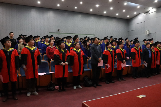 典礼在雄壮的国歌声中拉开序幕,典礼伊始,学院党委书记王中平致辞,他对全体毕业研究生致以热烈祝贺和美好祝福,欣慰于同学们寒窗十数载终有所得,欣喜于同学们成长为于国于家有望的人,王书记向提出了几点希冀,期待毕业生怀有坚韧不拔之志,对事有毅力,持之以恒,善假于物,以“德才馆”的名称诠释,告诫大家为人有信念,德才并举,厚积薄发,同时提醒同学们处群有态度,文墨诗书,饮流怀源,在未来平凡的生活中请不要忘记"诗与远方",不忘初心,砥砺前行。