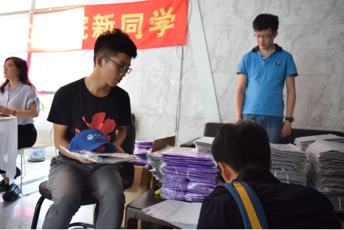 上午11点50分,现场迎来了第一批学院研究生新生,工作人员立即忙碌起来;12点整,迎新活动迎来一波小高潮,320旁排起了长队,从扫描身份证、查验应届生毕业证书与学位证书、收取户口迁移证、党组织关系介绍信、发放研究生证及校徽、解读培养计划、发放入学安排,再至各班班主任处报到、分发材料,最后领取院服等,整个流程有条不紊得进行,每一个环节均会有负责的老师陪同,每一个步骤均会有热情的工作人员辅助,迎新工作持续顺利进行中。
